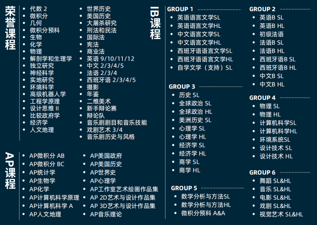 布罗沃德预备学校在高中阶段为学生提供了近250门不同种类不同难度的课程,其中包括:35门荣誉课程Honors,15门AP课程,64门IB课程。